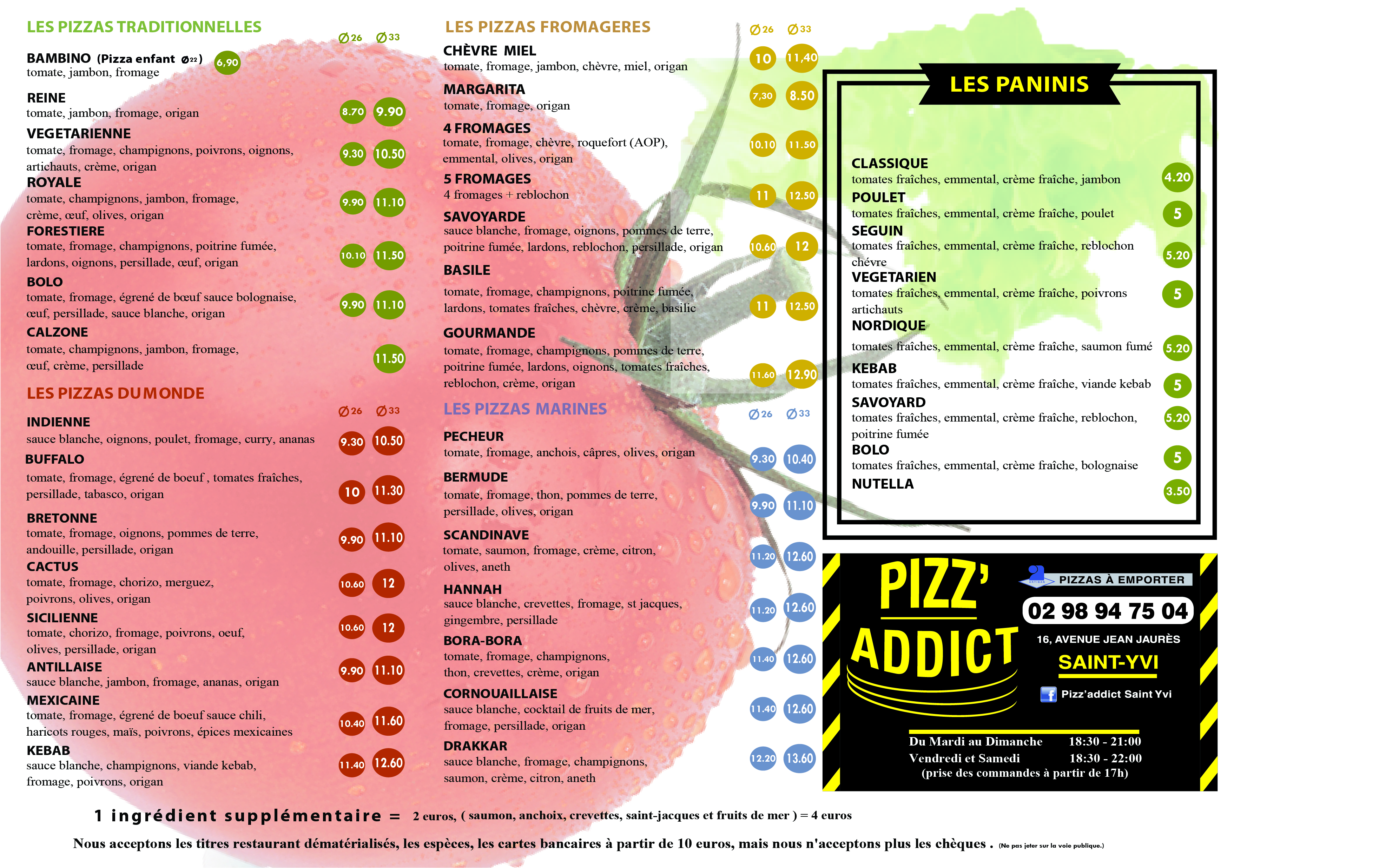 Voici toutes les informations sur le Pizzas à emporter PIZZ ' ADDICT qui ce trouve au 16 Rue Jean Jaurès, 29140 Saint-Yvi (29). Sur cette fiche vous trouverez les photos, l'adresse, les horaires d'ouverture, le numero de téléphone et les avis clients.Vous pouvez églement rédiger un avis si vous le souhaitez en bas de page.