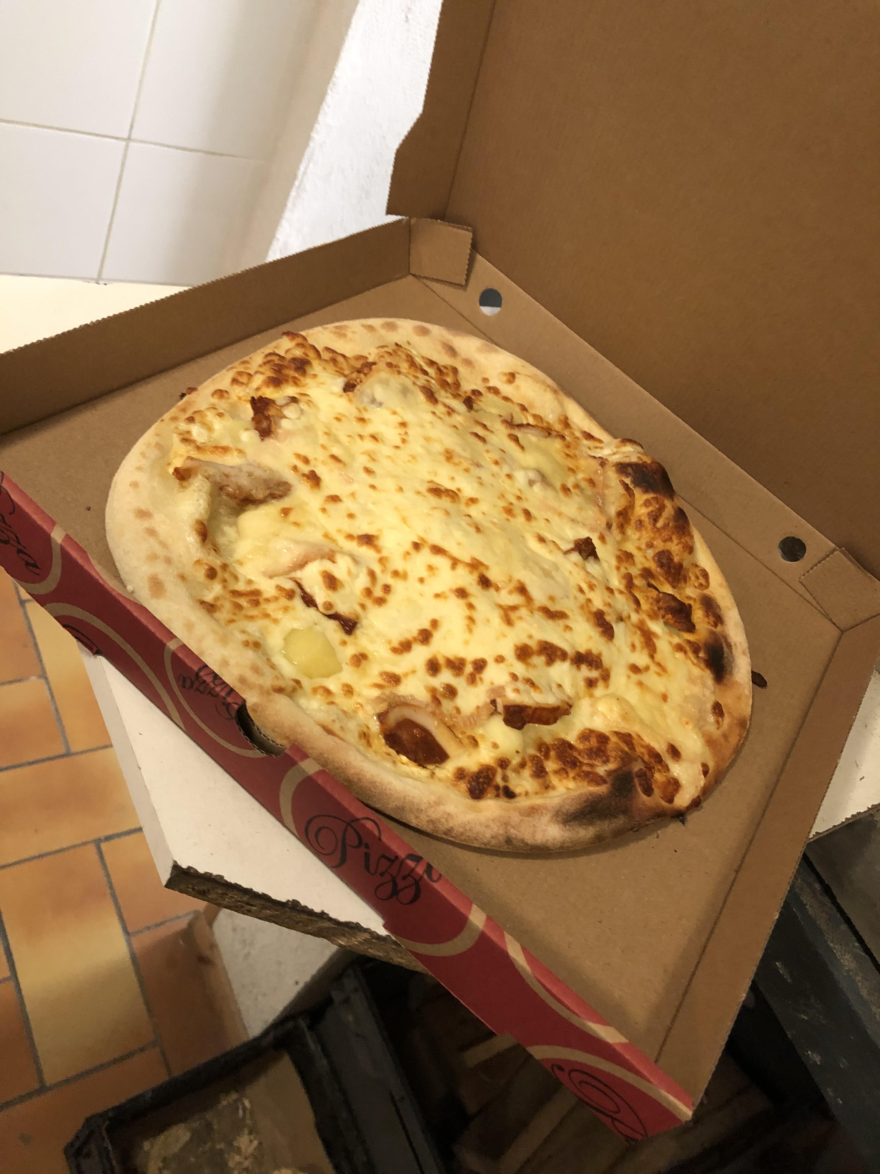 Super la pâte est faite maison cuit au feu de bois très bien garnies vraiment très bien